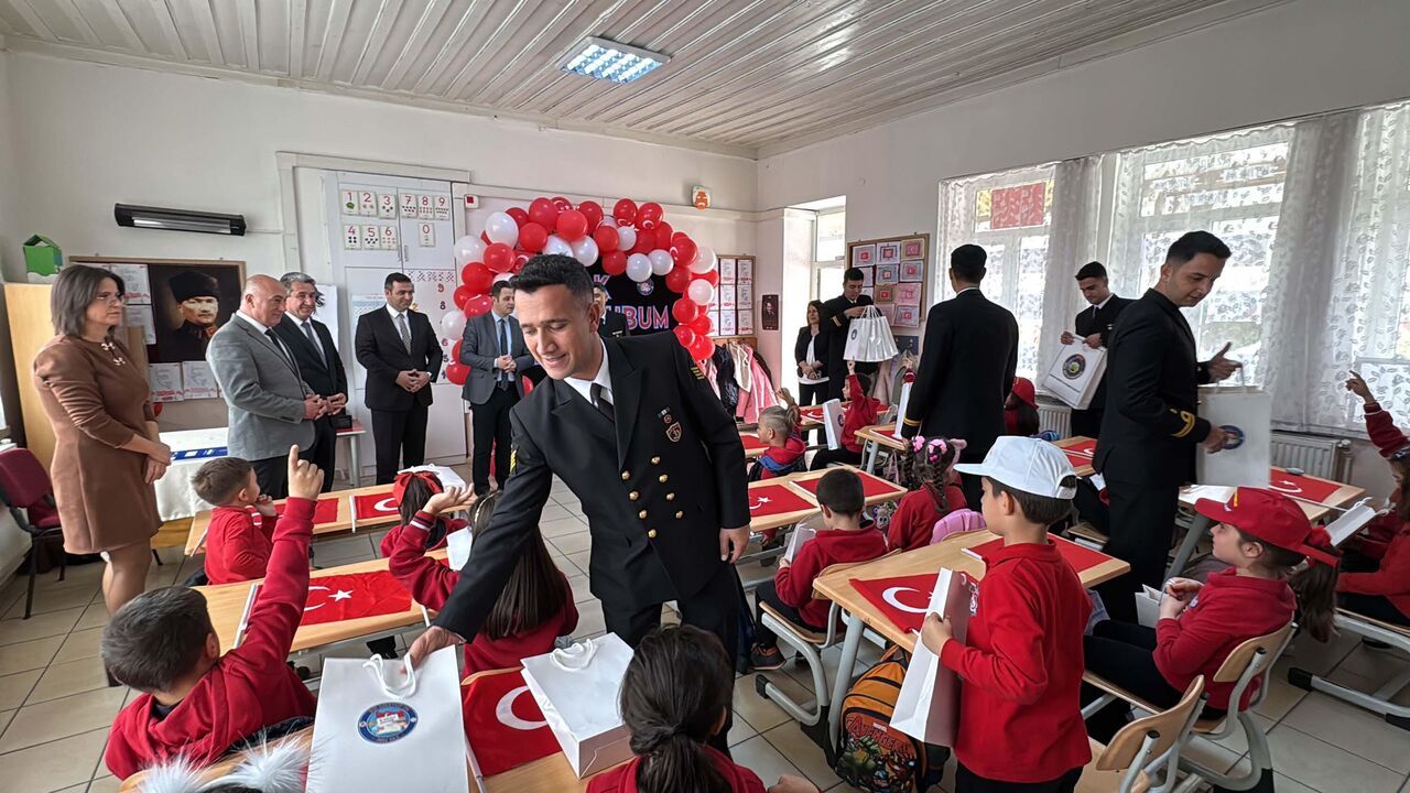 Muğla İl Milli Eğitim Müdürü Emre Çay ve Menteşe Milli Eğitim Müdürü İdris Kömürcü ile müdür yardımcıları, okul yöneticileri ve öğretmenlerin hazır bulunduğu programda, askeri personel tarafından öğrencilere Türk bayrağı, şapka ve çeşitli hediyeler takdim edildi. (DHA)