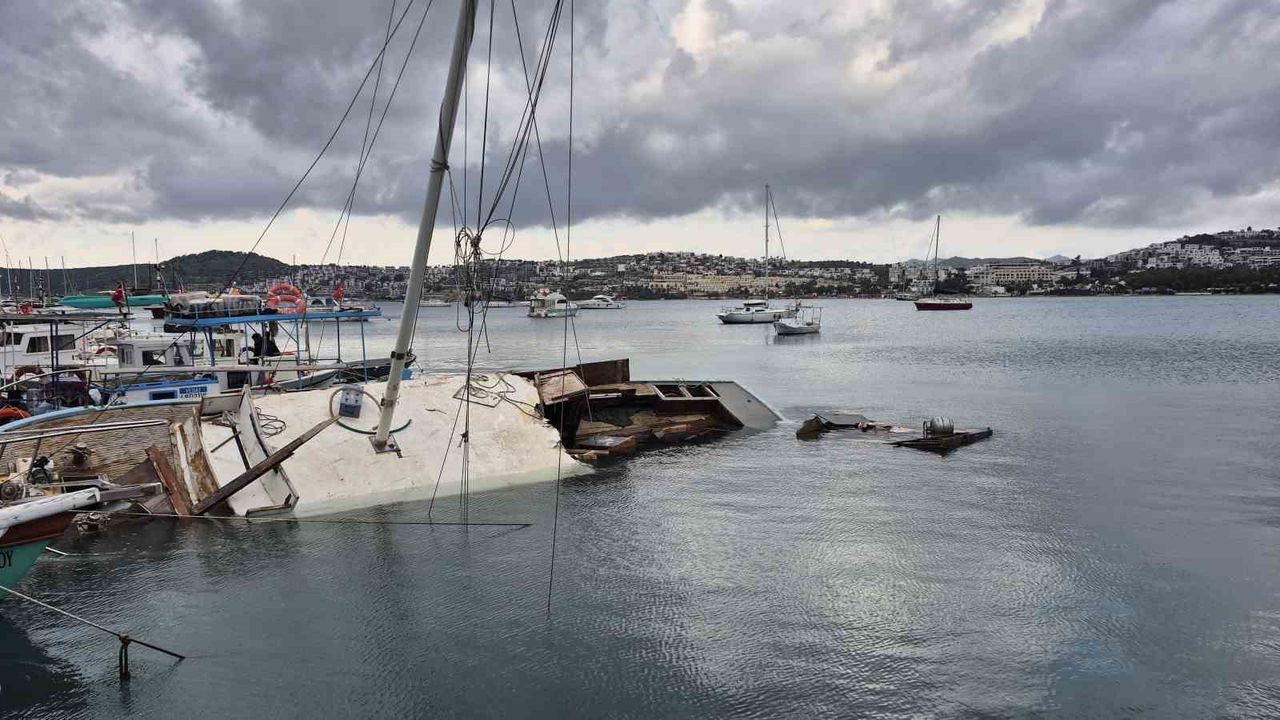 Muğla'nın Bodrum ilçesinde etkili olan kuvvetli rüzgarda yelkenli bir tekne su alarak yarıya kadar battı.