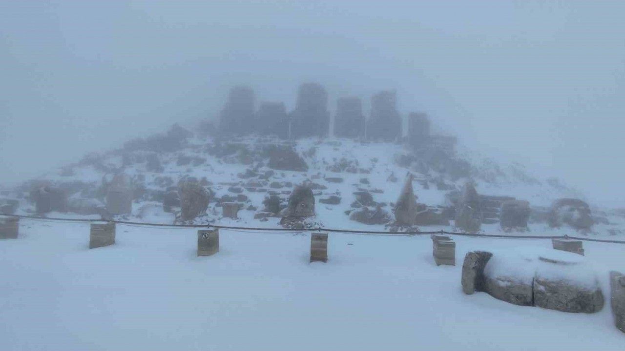 UNESCO Dünya Kültür Mirası Listesi’nde yer alan 2206 metre yükseklikteki Nemrut Dağı’na mevsimin ilk karı yağdı.