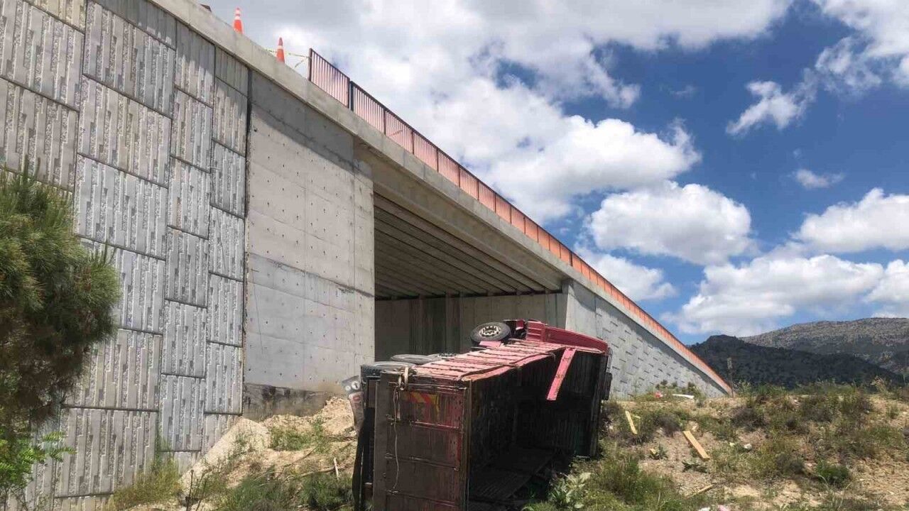 Denizli’nin Çardak ilçesinde önünde kaza yapan otomobile çarpmamak için sürücüsünün manevra yaptığı kamyon, 8 metrelik köprüden aşağı düştü.