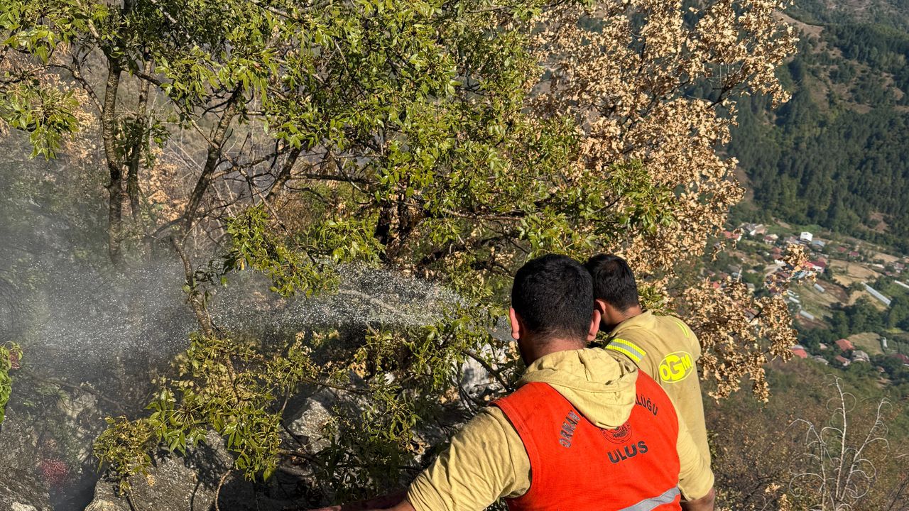 Geçen pazar günü Küre Dağları Milli Parkı’nda çıkan orman yangını, 3 helikopter ve kara ekiplerinin müdahalesiyle 6 saatte söndürüldü. Yangının ardından bölgede sarp kayalık arazide soğutma çalışmaları sürdürüldü. Dün akşam saatlerinde, Bartın Orman İşletme Müdürlüğü’ne bağlı işçiler, soğutma çalışması yaparken tehlike atlattı. Kayalık alanda çalışma yapan 3 işçi, rüzgarla bir anda büyüyen alevlerin arasında kalmaktan son anda kurtuldu. İşçilerin panik anları ve kayalıklardan tırmanarak uzaklaşmaları, Orman İşletme Müdürlüğü’nün dron kamerasına yansıdı. (DHA)