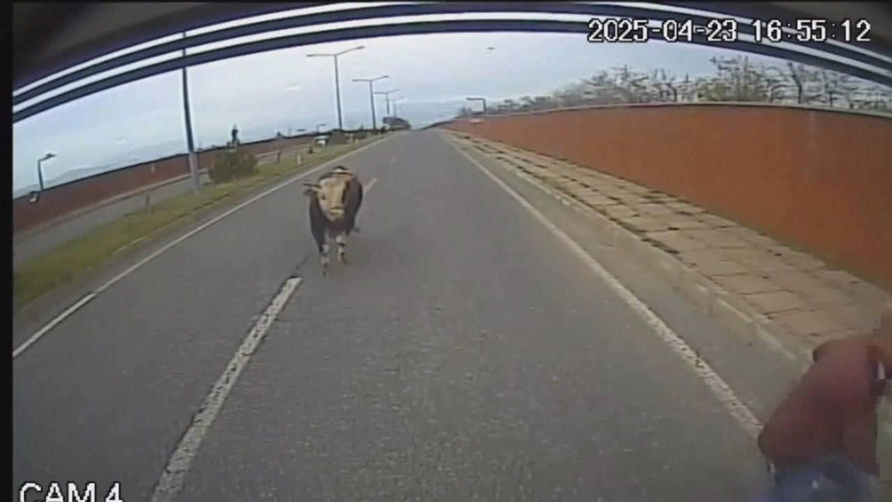Olay, dün akşam saatlerinde Bingöl-Genç kara yolunda 49’uncu Tugay Kavşağı yakınında meydana geldi. Mahmut Bürkük, 12 M 0009 plakalı halk otobüsü ile İçmeler seferini yaparken yola boğa çıktı. Bürkük korna çalarak bekledi ancak boğa yoldan uzaklaşmadı. Bunun üzerine Mahmut Bürkük, boğayı yoldan çıkarmak için eline bir sopa alarak otobüsten indi. Ancak hayvan, kendisine yaklaşan Bürkük’e saldırıp, kovaladı. Büyük panik yaşayan Mahmut Bürkük koşarak otobüse binip, bölgeden uzaklaştı. O anlar, otobüsün araç içi kamerasına yansıdı. (DHA)