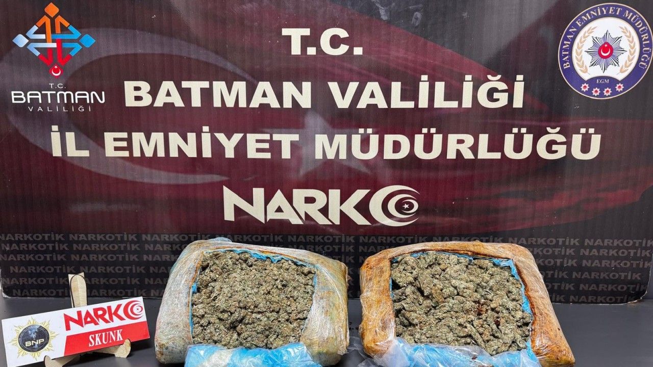 Bayram AYHAN/BATMAN, (DHA)- BATMAN'da, polis ekiplerinin narkotik köpek Mailo ile arama yaptığı otobüste, valizinde 2,5 kilo skunk ele geçirilen yolcu, tutuklandı.