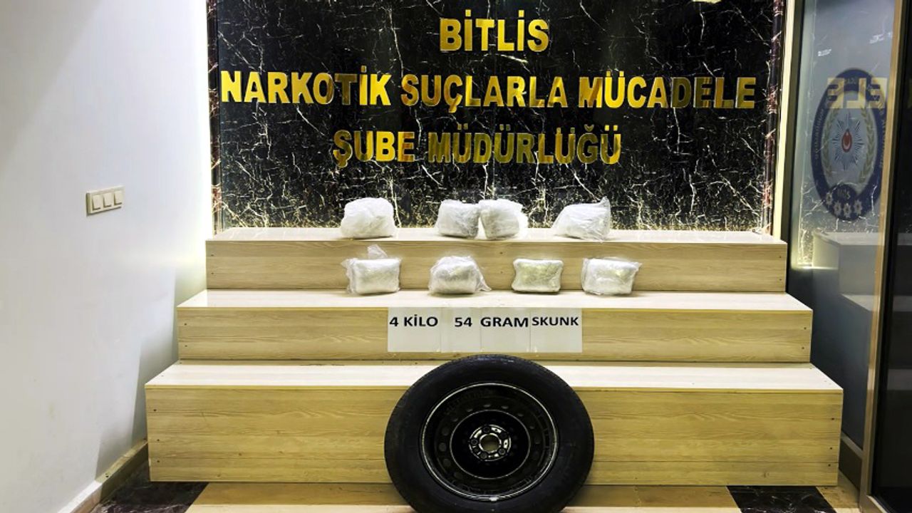 İl Emniyet Müdürlüğü Narkotik Suçlarla Mücadele Şubesi ekipleri, Tatvan ilçe girişinde bir otomobili durdurarak arama yaptı. Aracın yedek lastiğine gizlenmiş 8 parça haline 4 kilo 54 gram skunk ele geçirildi. Araçtaki 4 şüpheli gözaltına alındı. Şüpheliler, emniyetteki işlemlerinin ardından sevk edildikleri mahkemede tutuklandı. (DHA)