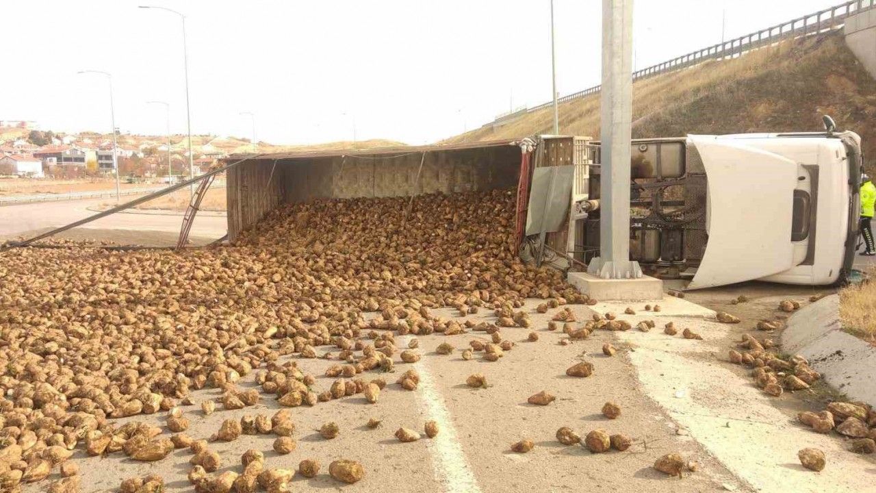 Edinilen bilgiye göre, Kırşehir-Aksaray kara yolu üzerinde sürücüsünün direksiyon hakimiyetini kaybettiği 40 AAU 916 plakalı pancar yüklü kamyon devrildi. Kamyonun devrilmesiyle kasasında bulunan onlarca kilo pancar yola savruldu. Durumun bildirilmesi üzerine kaza yerine jandarma ekipleri sevk edildi. Yaralananın olmadığı kazada ekipler yol üzerinde güvenlik önlemi alarak, temizlik çalışması yaptı.