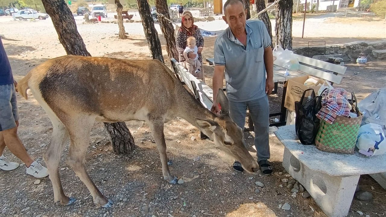 Mesut MADAN/BURDUR, (DHA)-BURDUR'da Salda Gölü çevresine bırakılan nesli tehlike altındaki kızıl geyiklerden biri, halk plajındaki piknikçilerin yanına kadar yaklaştı.