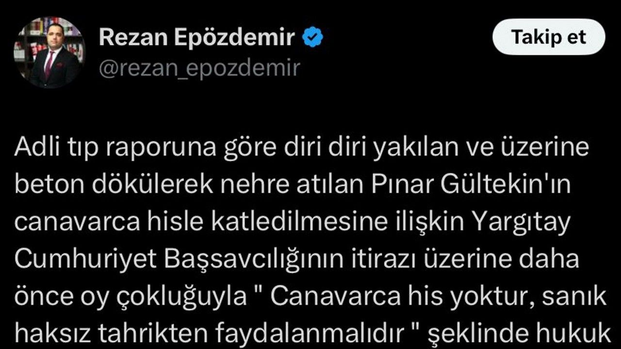 Sosyal medya hesabından paylaşımda bulunan Gültekin ailesinin avukatı Rezan Epözdemir, "Adli tıp raporuna göre diri diri yakılan ve üzerine beton dökülerek nehre atılan Pınar Gültekin'in canavarca hisle katledilmesine ilişkin Yargıtay Cumhuriyet Başsavcılığı'nın itirazı üzerine daha önce oy çokluğuyla 'Canavarca his yoktur, sanık haksız tahrikten faydalanmalıdır' şeklinde hukuk garabeti mahiyetinde bir karar veren Yargıtay 1'inci Ceza Dairesi, yine Başkan Vekili Osman Atalay ile üye Muzaffer Sayın'ın isabetli bir şekilde kaleme aldığı kapsamlı muhalefet şerhine rağmen, oy çokluğuyla (bu sefer heyette bir üye değişmiş) aynı kararı vermiş ve 3'e 2 şeklinde itirazı reddetmiş. Şimdi son sözü Yargıtay Ceza Genel Kurulu söyleyecek. Diri diri yakılan bir kadın Pınar Gültekin ve Yargıtay 1'inci Ceza Dairesi'nin 3 üyesi, 'Canavarca hisle öldürülmemiştir' diyor ve üstelik katilin haksız tahrik altında cinayeti işlediğinden bahisle cezasının indirilmesi gerektiğini söylüyor. Bu karar hukuk garabetidir ve gayri vicdani bir karar olarak Türk hukuk tarihinde yerini alacaktır. Yazıklar olsun" dedi. (DHA)
