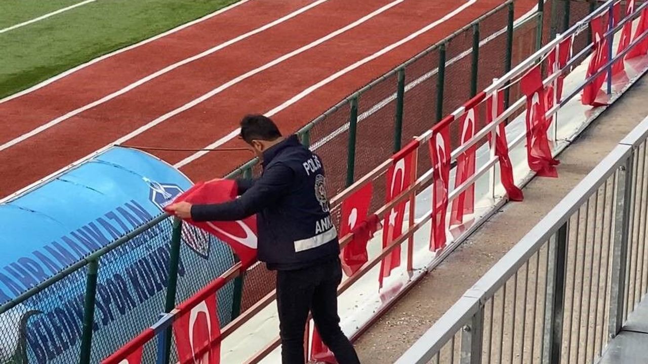 Ankara’da Kahramankazan Belediyespor-Keçiören Belediyesi Bağlumspor maçında rüzgardan dolayı katlanan bayrakları düzelten polis memurunun cep telefonu kamerasına yansıyan görüntüsü yürekleri ısıttı.