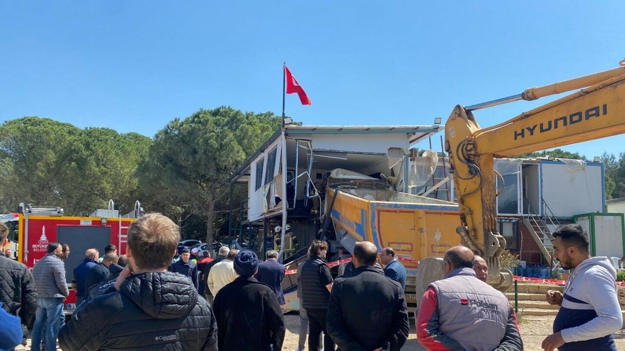 Tolga TAHÇI/İZMİR, (DHA)- İZMİR'in Buca ilçesinde, hafriyat döküm sahasında ofis olarak kullanılan prefabrik eve çarpan hafriyat kamyonunun şoförü Rıfat Çetinkaya (58), yaşamını yitirdi.