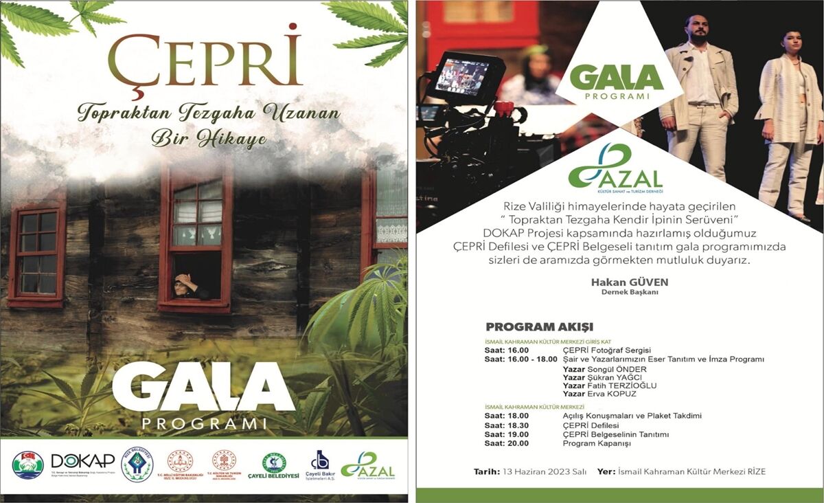 AZALDER’in Doğu Karadeniz Kalkınma Ajansı (DOKAP) iş birliği ile Rize Valiliği himayesinde sürdürdüğü “Topraktan Tezgaha Kendir İpinin Serüveni Projesi” tüm aşamaları ile hayata geçiyor. Kendir ipi ile feretiko dokuma sürecinin atölyelerle hayata geçirildiği projede elde edilen kumaşlardan yapılan tasarımlar hazırlanan defile ile beğeniye sunulacak. Çepri’ defilesi ve belgeselinin tanıtım galası 13 Haziran’da yapılacak. İsmail Kahraman Kültür Merkezi’nde saat 16.00'da başlayacak programda çepri fotoğraf sergisinin açılışı yapılacak. Yazarlar Songül Önder, Şükran Yağcı, Fatih Terzioğlu, Erva Kopuz’un eser tanıtım ve imza programı ile program devam edecek. Saat 18’de ise kenevir ipinden dokunarak elde edilen feretiko bezinden hazırlanan ürünler ‘Çepri’ defilesi ile beğeniye sunulacak. Topraktan tezgaha kendir ipinin serüvenin anlatıldığı ‘Çepri’ belgeselinin izlenmesi ile program devam edecek.