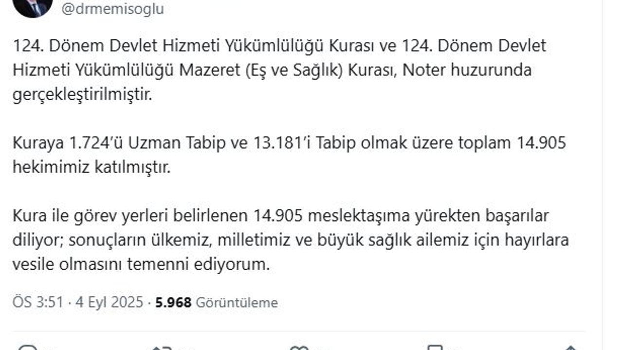 Sağlık Bakanı Kemal Memişoğlu, sosyal medya hesabından yaptığı açıklamada, "124'üncü Dönem Devlet Hizmeti Yükümlülüğü kurası ve 124'üncü Dönem Devlet Hizmeti Yükümlülüğü Mazeret (eş ve sağlık) kurası, noter huzurunda gerçekleştirilmiştir. Kuraya 1724'ü uzman tabip ve 13 bin 181'i tabip olmak üzere toplam 14 bin 905 hekimimiz katılmıştır. Kura ile görev yerleri belirlenen 14 bin 905 meslektaşıma yürekten başarılar diliyor; sonuçların ülkemiz, milletimiz ve büyük sağlık ailemiz için hayırlara vesile olmasını temenni ediyorum" dedi. (DHA)