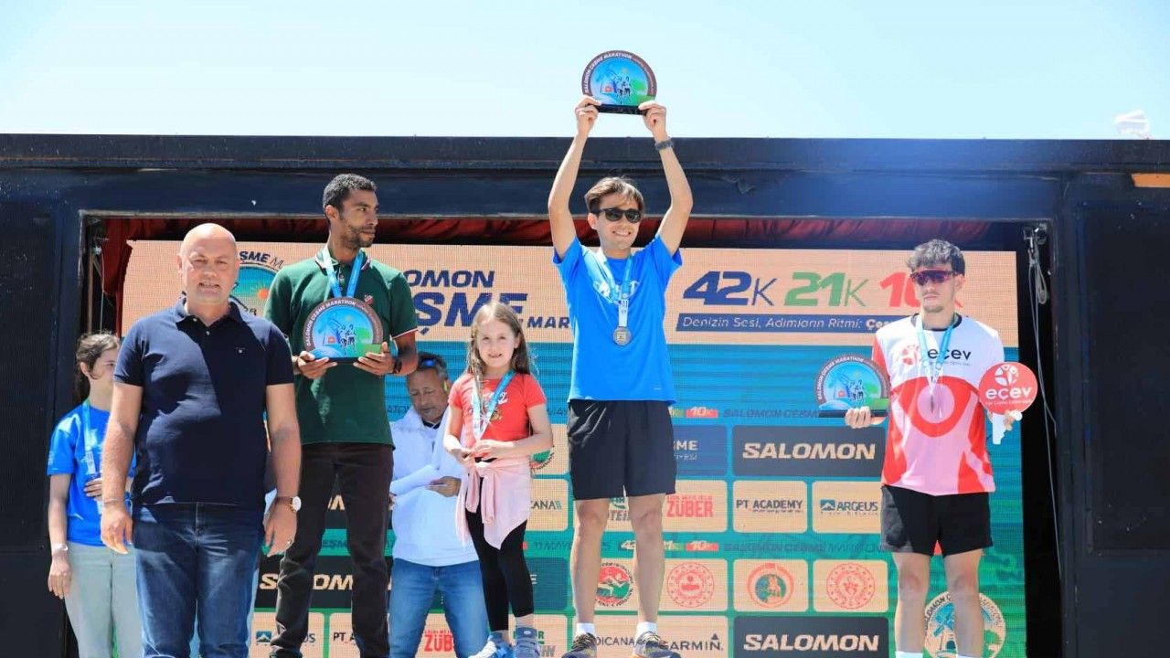 Öte yandan paralimpik kategorisinde 10K'da yarışan görme engelli sporcu Nurdan Kılıçlı ile eşlik eden Vedat Ekiz'e Çeşme Kaymakamı Mehmet Maraşlı ödül takdim etti.