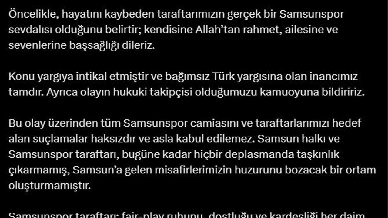 Samsunspor taraftarları hakkında yapılan suçlamaların hiçbirinin gerçeği yansıtmadığını belirten Erdoğan, “Son günlerde yaşanan üzücü olayın ardından şehrimiz, Samsunspor camiamız ve taraftarlarımız hakkında yapılan haksız yakıştırmalar üzerine açıklama yapma zorunluluğu doğmuştur. Öncelikle, hayatını kaybeden taraftarımızın gerçek bir Samsunspor sevdalısı olduğunu belirtir; kendisine Allah’tan rahmet, ailesine ve sevenlerine başsağlığı dileriz. Konu yargıya intikal etmiştir ve bağımsız Türk yargısına olan inancımız tamdır. Ayrıca olayın hukuki takipçisi olduğumuzu kamuoyuna bildiririz. Bu olay üzerinden tüm Samsunspor camiasını ve taraftarlarımızı hedef alan suçlamalar haksızdır ve asla kabul edilemez. Samsun halkı ve Samsunspor taraftarı, bugüne kadar hiçbir deplasmanda taşkınlık çıkarmamış, Samsun’a gelen misafirlerimizin huzurunu bozacak bir ortam oluşturmamıştır. Samsunspor taraftarı; fair-play ruhunu, dostluğu ve kardeşliği her daim yaşatan, şehrine ve takımına gönülden bağlı bir topluluktur. Yargıya taşınmış bir olay üzerinden koca bir camiaya ve şehre gölge düşürmek, saldırıda bulunmak ne vicdana ne de adalet anlayışına sığmaktadır. Samsunspor Kulübü olarak, şiddetin her türlüsüne karşı olduğumuzu bir kez daha vurguluyor; dostluğu, centilmenliği ve kardeşliği yaşatmaya kararlılıkla devam edeceğimizi kamuoyunun bilgisine saygıyla sunuyoruz” ifadelerini kullandı. (DHA)