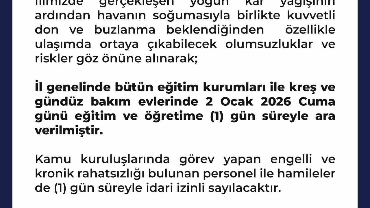 Şanlıurfa Valisi Hasan Şıldak, sosyal medya hesabından yaptığı açıklamada, 'Sevgili öğrencilerimiz, öncelikle değerli aileleriniz ve öğretmenlerinizle birlikte hepinizin yeni yılını kutluyorum. 2026 yılının size başarı, sağlık ve güzellikler getirmesini diliyorum. Şanlıurfa'da eğitimi her zaman en öncelikli konu olarak ele alıyor ve sizin en iyi şartlarda eğitim almanız, daha çok başarılı olmanız için çalışıyoruz' diyerek, muhtemel buzlanma ve sis nedeniyle il genelindeki bütün eğitim kurumlarında yarın eğitime ara verildiğini duyurdu.