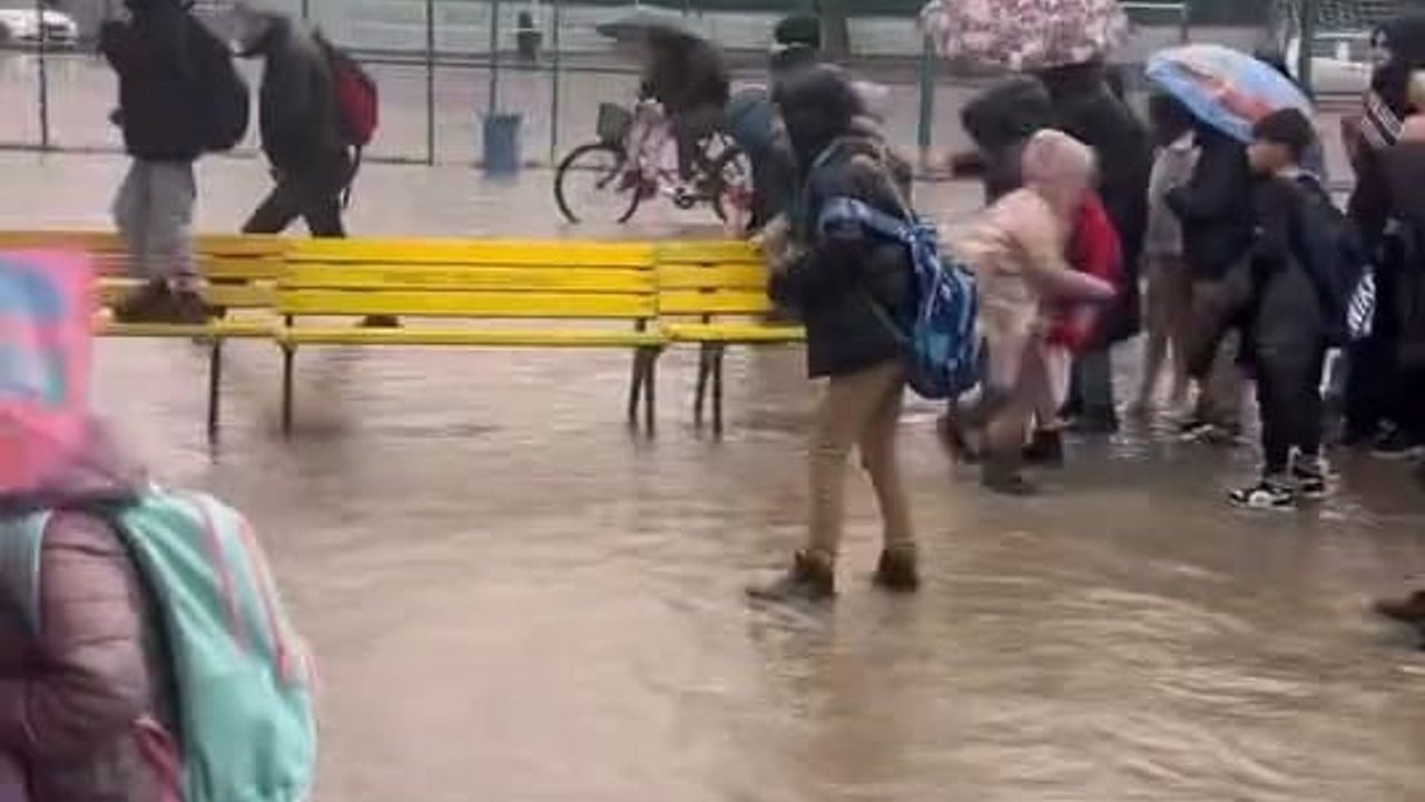 Olay Mahmudiye Mahallesi'nde eğitim öğretime devam eden Müşerref Muzaffer Samda İlkokulu bahçesinde meydana geldi. Yoğun yağış nedeniyle okulun bahçesi göle döndü. Veliler öğrencileri okuldan çıkarmak için bankları sıralayıp geçirdiler