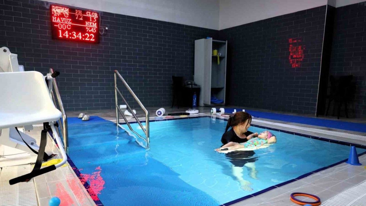 Merkezden hizmet alan 4 yaşındaki Duru Atasoy da uzmanlar eşliğinde hidroterapi seanslarına katılıyor. Serebral palsi tanısı bulunan Atasoy için su içinde vücut farkındalığı, denge ve kol kuvvetlendirme egzersizleri uygulanıyor.