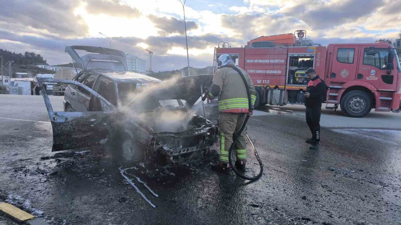 Hatay'da seyir halindeyken alevlere teslim olan TOFAŞ marka otomobil, yanarak kullanılamaz hale geldi.