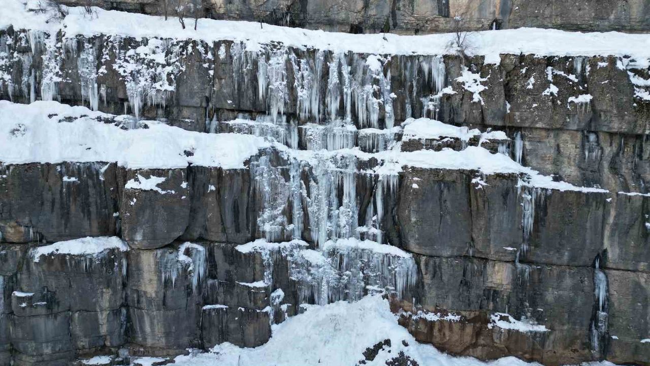Yoğun kar yağışının ardından hava sıcaklığı eksilere düşen Beytüşşebap ilçesinde kayalarda oluşan dev sarkıtlar görenleri hayrete düşürüyor. Dondurucu soğukların etkisiyle ilçeye bağlı Aşağıdere köyü yakınlarındaki dağlar buz kesti. Hava sıcaklığının eksi 20 dereceyi bulmasıyla dağlardan çıkan sular buza dönüştü. Metrelerce uzunluktaki buz sarkıtları dronla görüntülendi.