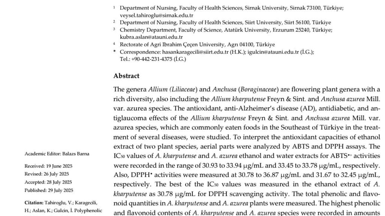 Şırnak Üniversitesi Bilimsel Araştırma Proje Koordinatörlüğü’nün desteğiyle, Dr. Öğr. Üyesi Veysel Tahiroğlu tarafından yürütülen bilimsel çalışmada, kente özgü ve doğal olarak yetişen ve halk arasında ‘Soryaz’ olarak bilinen Harput Soğanı (Allium kharputense) ve ‘Guriz’ olarak bilinen Sığır Dili (Anchusa azurea) isimli bitkilerin, Alzheimer, diyabet ve glokom hastalıklarına karşı etkili olduğu belirlendi. Bitkilerin ayrıca güçlü antioksidan özelliklere sahip olduğu da tespit edildi. Şırnak Üniversitesi Teknoloji ve Araştırma Merkezi Müdürü Dr. Öğr. Üyesi Veysel Tahiroğlu’nun öncülüğündeki çalışmaya; Ağrı İbrahim Çeçen Üniversitesi Rektörü Prof. Dr. İlhami Gülçin, Siirt Üniversitesi Sağlık Bilimleri Fakültesi’nden Doç. Dr. Hasan Karageçili ve Atatürk Üniversitesi’nden Arş. Gör. Kübra Aslan da katkı sundu. Çalışma, SCI-Expanded (SCI-Ex) kapsamında Q1 kategorisinde bir uluslararası dergide yayımlandı.