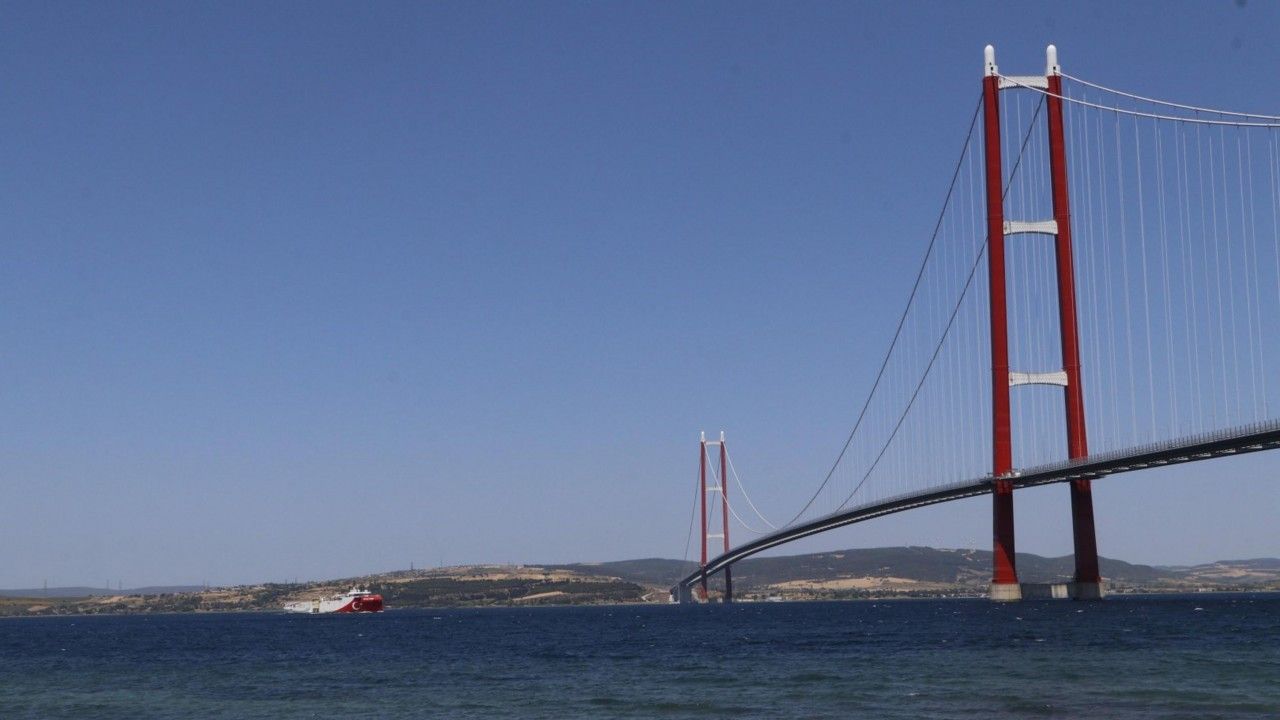 Somali'de gerçekleştirdiği ilk kıtalar arası görevini başarıyla tamamlayan Oruç Reis Sismik Araştırma Gemisi, saat 12.00 sıralarında 1915 Çanakkale Köprüsü'nün altından geçip, Marmara Denizi'ne doğru yol aldı. (DHA)