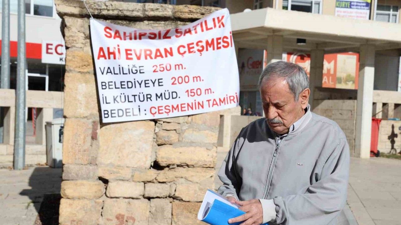 KIRŞEHİR (İHA) – Kırşehir’de Ahi Evran Külliyesi’nde yer alan tarihi çeşmenin bakımsızlığına dikkat çekmek isteyen Ahmet Fahri Ekim, suyu akmayan çeşmeye pankart asarak tek kişilik eylem gerçekleştirdi.