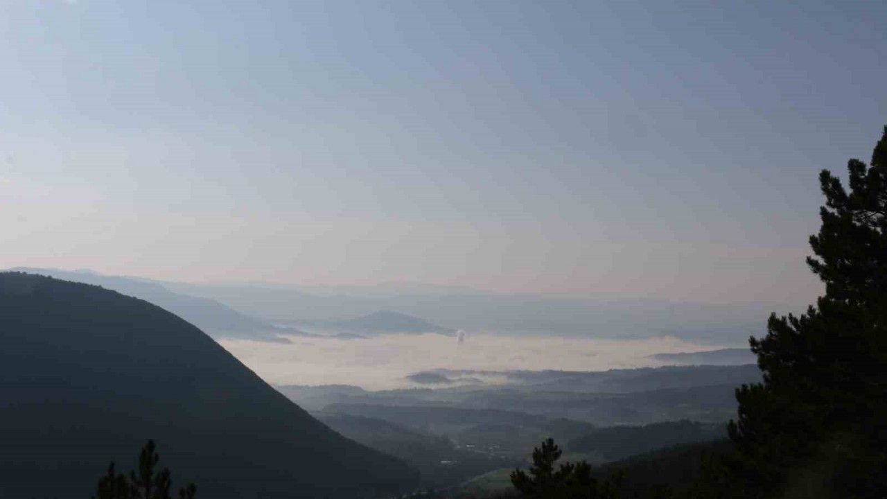 Bolu’nun turizm merkezlerinden Abant Gölü Milli Parkı’nın yüksek kesimlerinden, tarihi Mudurnu ilçesi görüntülendi. Sabah saatlerinde ilçeye çöken yoğun sis tabakasının arasından yükselen dağlar kartpostallık manzaralar oluşturdu.
