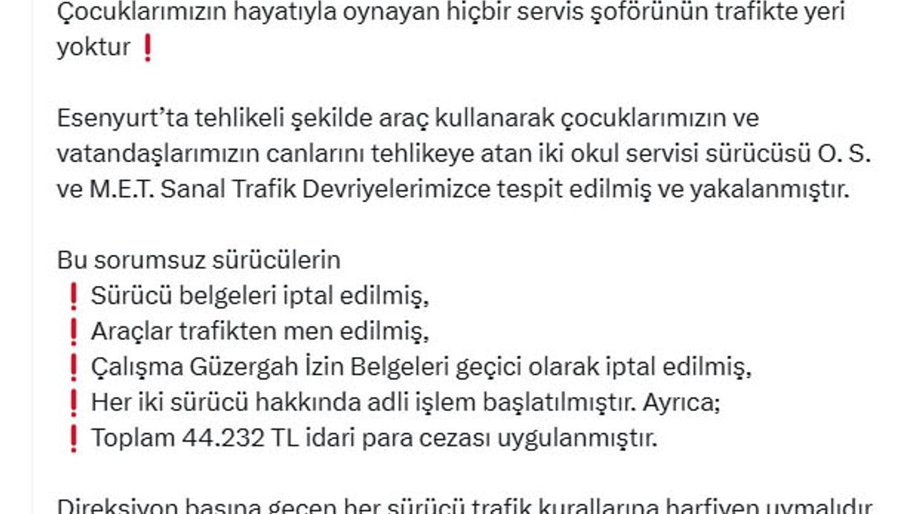 Bakan Ali Yerlikaya, trafikte art arda tehlikeli halde seyrederken cep telefonu kamerasına yansıyan iki okul servisine ilişkin görüntüyü sosyal medya hesabından paylaşarak, "Esenyurt’ta tehlikeli şekilde araç kullanarak çocuklarımızın ve vatandaşlarımızın canlarını tehlikeye atan iki okul servisi sürücüsü O.S. ve M.E.T., sanal trafik devriyelerimizce tespit edilmiş ve yakalanmıştır" dedi.