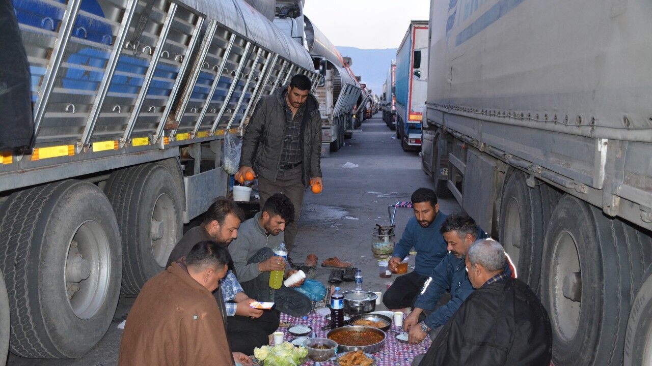 Silopi’de Habur Sınır Kapısı üzerinden Irak’a yük taşıyan TIR şoförleri, sıra beklerken yemeklerini araçlarının dorsesindeki dolaplarda hazırlayarak iftarlarını açıyor. Dorse dolapları seyyar bir mutfağa çevrilerek pişirilen yöresel yemekler, iftar zamanı kasalarda veya yere serilen sofralarda diğer şoförlerle birlikte yeniliyor. Özellikle Şanlıurfalı şoförler, iftar sofralarında kentleriyle özdeşleşmiş çiğ köfte hazırlayarak iftarı bekliyor.