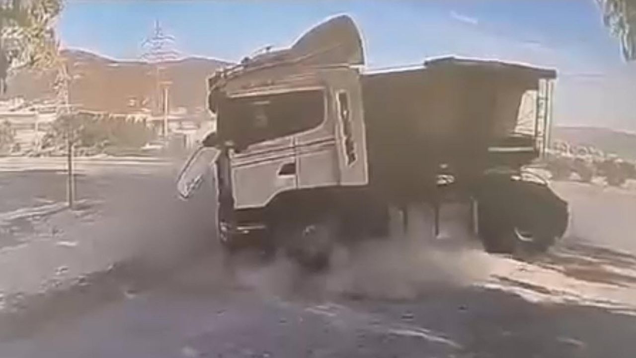 Fırat AKAY/MİLAS (Muğla), (DHA)- MUĞLA'nın Milas ilçesinde önünde ani manevra yapan motosiklete çarpmamak için sürücüsünün direksiyon kırdığı TIR, yol kenarına çıktı. O anlar yakındaki bir iş yerinin güvenlik kameralarına yansıdı.
