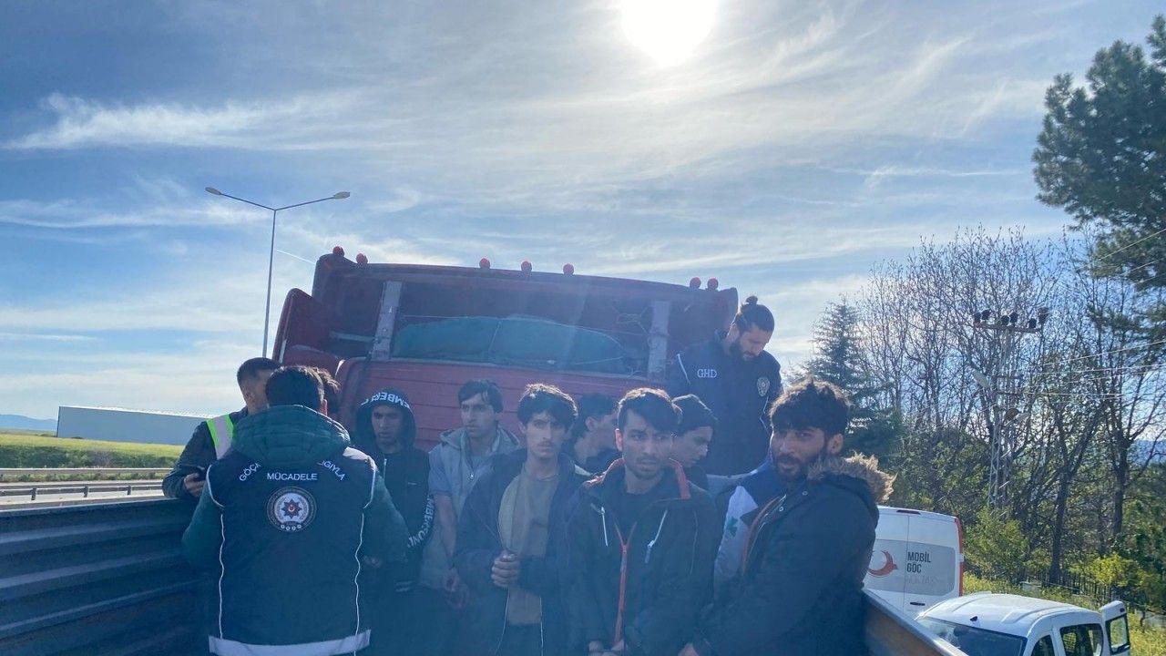 Dün akşam saatlerinde doğu illerinden batı kentlerine düzensiz göçmen taşıdığı değerlendirilen TIR, Merzifon ilçesi uygulama noktasında durduruldu. İl Emniyet Müdürlüğü Göçmen Kaçakçılığıyla Mücadele ve Hudut Kapıları Şube Müdürlüğü ekipleri, TIR'da arama yaptı. Kontrolde, TIR'ın dorsesinde üzerleri brandayla örtülü, etrafı kalaslarla kapatılmış yaşları 18 ile 30 arasında değişen 7 Afganistan uyruklu ve 3 Pakistan uyruklu olmak üzere toplam 10 kaçak göçmen yakalandı. Organizatör olduğu değerlendirilen TIR sürücüsü Y.Ü. ve yanındaki İ.G. gözaltına alınırken, parmak izleri alınan kaçak göçmenler sınır dışı edilmek üzere Amasya Göç İdaresi Müdürlüğü’ne götürüldü.