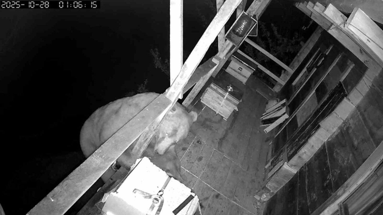 Trabzon’un Of ilçesi Keler Mahallesi’nde ilginç bir olay yaşandı. Mahalle sakinlerinden Mustafa Tüfekçi, evine yaklaştığı sırada balkondaki arı kovanının yerinde olmadığını görünce endişelenerek hemen eve çıktı. Evin üst katına çıkarak kovanların olduğu balkona giren Tüfekçi, gördüklerine inanamadı. Balkonun ahşap tırabzanının kırık, arı kovanlarının da dağınık olduğunu gören Tüfekçi, hemen köşede takılı güvenlik kamerasının kayıtlarını inceledi. Tüfekçi, görüntülerde evin balkonuna tırmanan ayının kovanları açıp balı afiyetle yendiğini gördü. Gece karanlığında balkona çıkan ayının balı bitiremeyince ertesi gün yeniden gelerek kaldığı yerden devam ettiği anlar da güvenlik kamerasına saniye saniye yansıdı. Ayının balkona ustaca tırmanışı ve yeniden aşağıya aynı ustalıkla inişi ise dikkat çekici görüntüler oluşturdu.