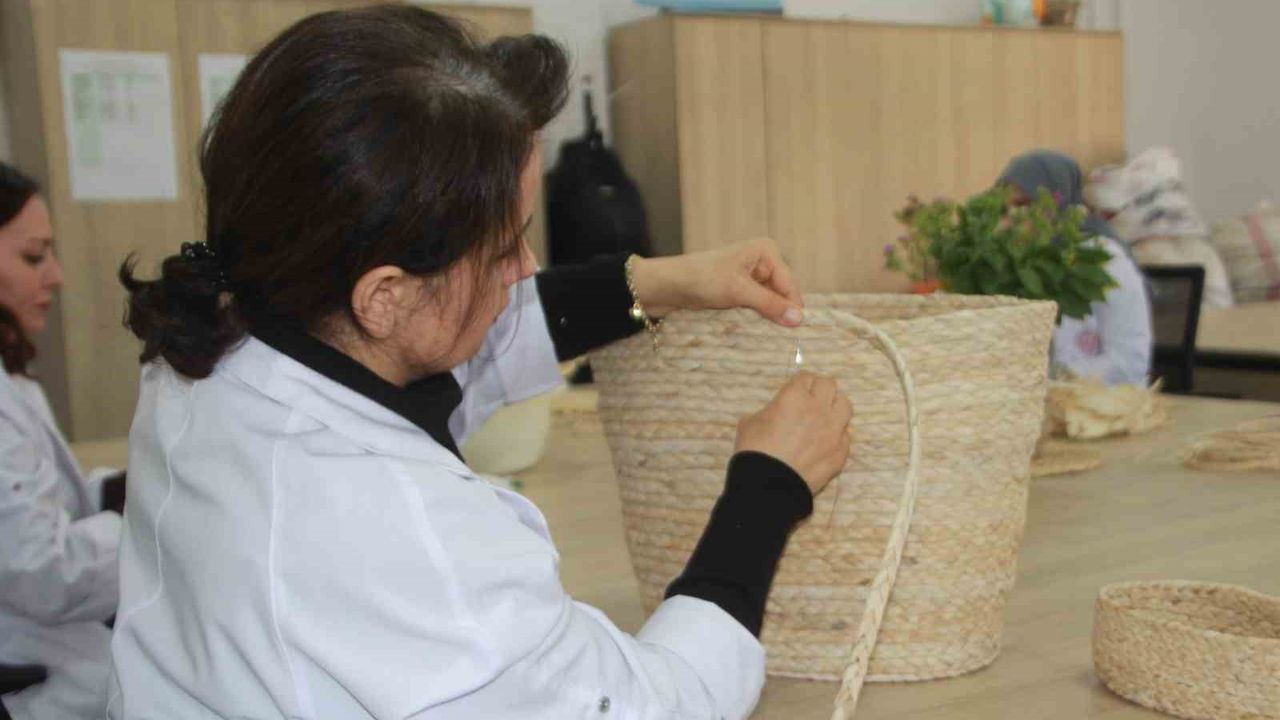 Bitkisel Örücülük Atölyesi'nde usta öğretici Zeliha Bektaş da mısır kabuğunun doğal yapısına uygun tekniklerle işlendiğini belirterek, üretim sürecinde emeğin yoğun olduğuna vurgu yaptı. Bektaş, 'Mısır kabukları üreticilerimizden geliyor. Kurumumuzda yeniden işlenebilir hale getiriyoruz. İp formuna dönüştürdüğümüz kabukları, tasarlanan ürünlere göre örüyoruz. Ortaya çıkan her parça sadece bir ev ürünü değil, geçmişten bugüne taşınan bir üretim kültürünün yansıması. Zor bir zanaat ama severek yapıyoruz' ifadelerini kullandı.