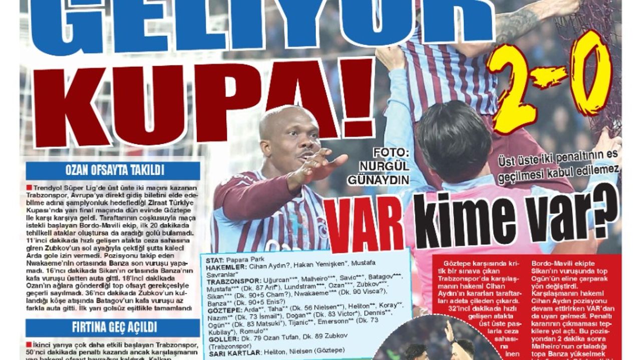 Öte yandan Trabzon’da yayın yapan yerel gazeteler de bordo-mavili takımın Göztepe’yi mağlup ederek adını finale yazdırmasını farklı başlıklarla manşetlerine taşıdı.