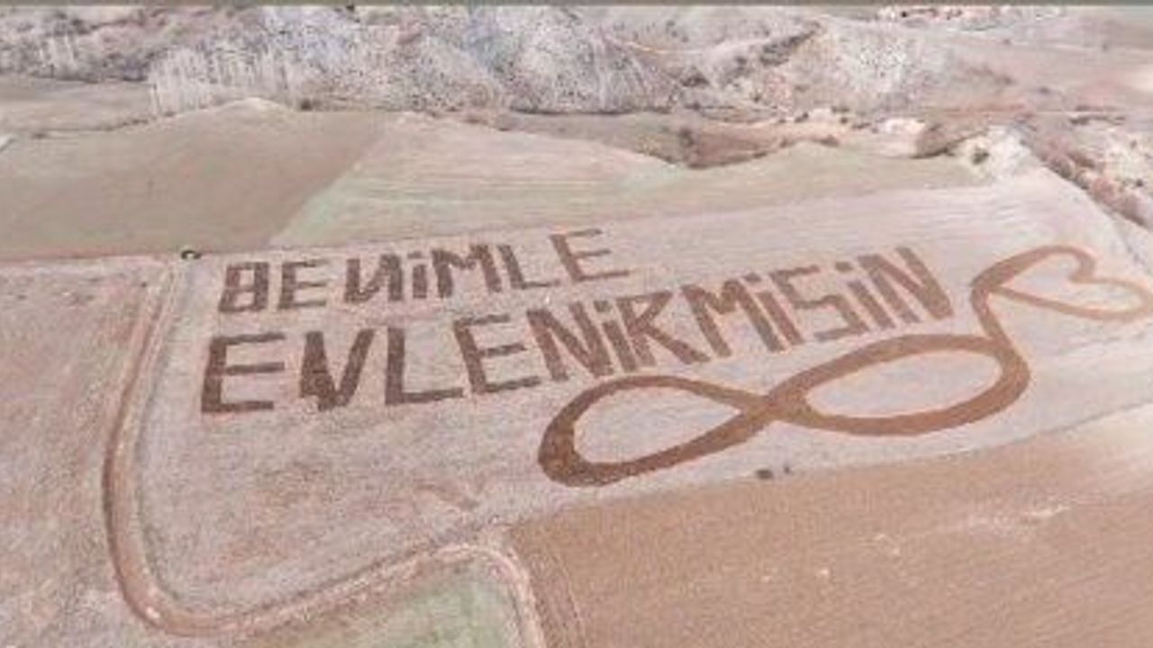 Mehmet KABA/ İSKİLİP (Çorum), (DHA)- ÇORUM'un İskilip ilçesinde çiftçilik yapan Cihat Ayva, Ayşe Nur Candan'a sürpriz yaparak, traktörüyle tarlasına ‘Benimle evlenir misin’ diye yazdı. Genç kız gördüğü manzara karşısında şaşkınlığını gizleyemezken, evlilik teklifine ‘evet’ dedi.
