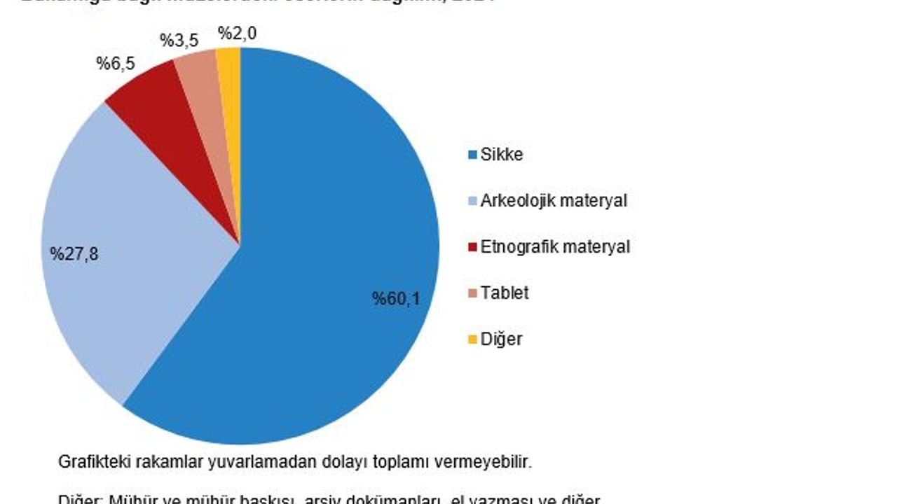 Müzelerdeki eser sayısı önceki yıla göre yüzde 2,4 artarak 3 milyon 995 bin 133 oldu. Bakanlığa bağlı müzelerdeki eser sayısı geçen yıla göre yüzde 0,9 artarak 3 milyon 370 bin 881 olurken, özel müzelerdeki eser sayısı yüzde 1,7 artarak 291 bin 89, Milli Saraylar Başkanlığı'na bağlı müzelerdeki eser sayısı yüzde 22,1 artarak 333 bin 163 oldu. Bakanlığa bağlı müzelerdeki eserlerin yüzde 60,1'i sikke, yüzde 27,8'i arkeolojik materyal, yüzde 6,5'i etnografik materyal, yüzde 3,5'i tablet oldu.