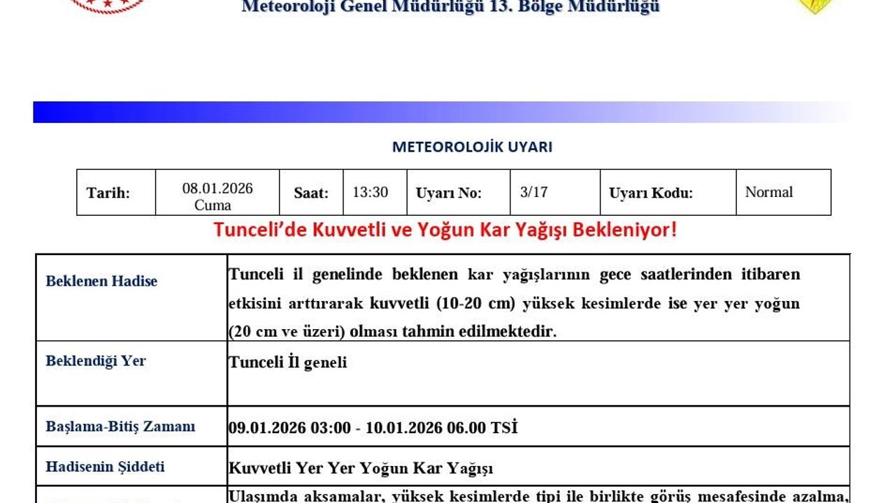 Meteoroloji 13. Bölge Müdürlüğü'nden yapılan uyarıda, 'Tunceli il genelinde beklenen kar yağışlarının sabah saatlerinden itibaren etkisini arttırarak kuvvetli (10-20 cm) yüksek kesimlerde ise yer yer yoğun (20 cm ve üzeri) olması tahmin edilmektedir. Ulaşımda aksamalar, yüksek kesimlerde tipi ile birlikte görüş mesafesinde azalma, buzlanma ve don olayı, yüksek kar örtüsüne sahip eğimli bölgelerde çığ gibi olumsuzluklara karşı dikkatli ve tedbirli olunmalıdır' denildi.