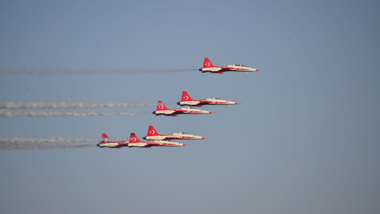 Türkiye Büyük Millet Meclisi'nin (TBMM) açılışının 105'inci yılı ve 23 Nisan Ulusal Egemenlik ve Çocuk Bayramı, tüm yurtta olduğu gibi Antalya'da da coşkuyla kutlanıyor. Türk Hava Kuvvetleri'ne bağlı akrobasi timi Türk Yıldızları, Konyaaltı Sahili'nde gösteri uçuşu yaptı. Gösteriyi izlemek isteyen yüzlerce vatandaş, çocuklarıyla birlikte saatler öncesinde Konyaaltı Sahili ve çevresini doldurdu. Saat 18.00 sıralarında falezler üzerinden gelerek sahil üzerinde manevralar yapan Türk Yıldızları, izleyenlere heyecanlı dakikalar yaşattı. Özellikle çocukların ilgi gösterdiği gösteri uçuşunda pilotlar akrobatik hareketlere imza attı. Kimi zaman birbirlerine yakın geçiş yaparak izleyenleri heyecanlandıran pilotlara, sahildeki vatandaşlar da ellerindeki Türk bayraklarını sallayarak karşılık verdi. (DHA)