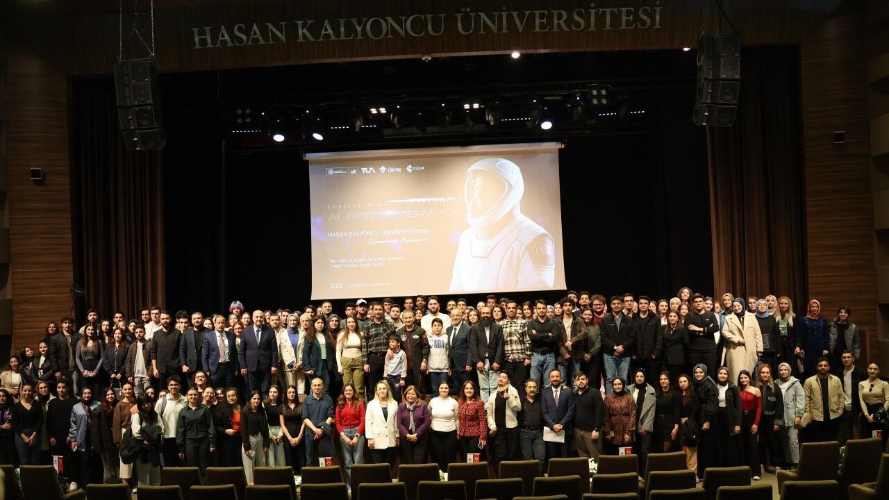 Hasan Kalyoncu Üniversitesi'nde düzenlenen etkinliğe; Türkiye'nin ilk astronotu Alper Gezeravcı’nın yanı sıra Hasan Kalyoncu Üniversitesi Rektörü Prof. Dr. Türkay Dereli, Rektör Yardımcıları Prof. Dr. Mehmet Lütfi Yola ve Prof. Dr. Gül Rengin Küçükerdoğan, akademisyenler ve öğrenciler katıldı. Programın açılışında konuşan, Alper Gezeravcı’nın, Türkiye’nin uzay alanındaki vizyonunu öğrencilerle paylaşmasının büyük bir motivasyon kaynağı olduğunu belirten Rektör Prof. Dr. Türkay Dereli, "Bizler, tarihte havacılık ve uzay alanında büyük hayaller kurmuş bir milletin evlatlarıyız. Vecihi Hürkuş’tan Nuri Demirağ’a, Selçuk Bayraktar gibi vizyoner mühendislerden, bugün semalarımızda süzülen KAAN, ANKA, Bayraktar Kızılelma gibi projelere kadar uzanan bu yolculuk, geleceğe olan inancımızın bir göstergesidir. Üniversite olarak, ülkemizin havacılık ve uzay alanındaki hedeflerine katkı sunmak için önemli adımlar atmaktayız. Havacılık ve Uzay Bilimleri Fakültemiz, Eylül 2022'de ilk öğrencilerini kabul ederek eğitim hayatına başlamış, geleceğin havacılık, uzay ve savunma sanayi mühendislerini yetiştirme misyonuyla yola çıkmıştır. TUSAŞ, TEI ve savunma sanayi kuruluşlarıyla yaptığımız projeler, öğrencilerimizin gerçek Ar-Ge süreçlerinde yer almasını sağlıyor. Türkiye’nin uzaydaki yerini sağlamlaştırmak için, bilime, teknolojiye ve araştırmaya daha fazla yatırım yapmaya devam edeceğiz" dedi.