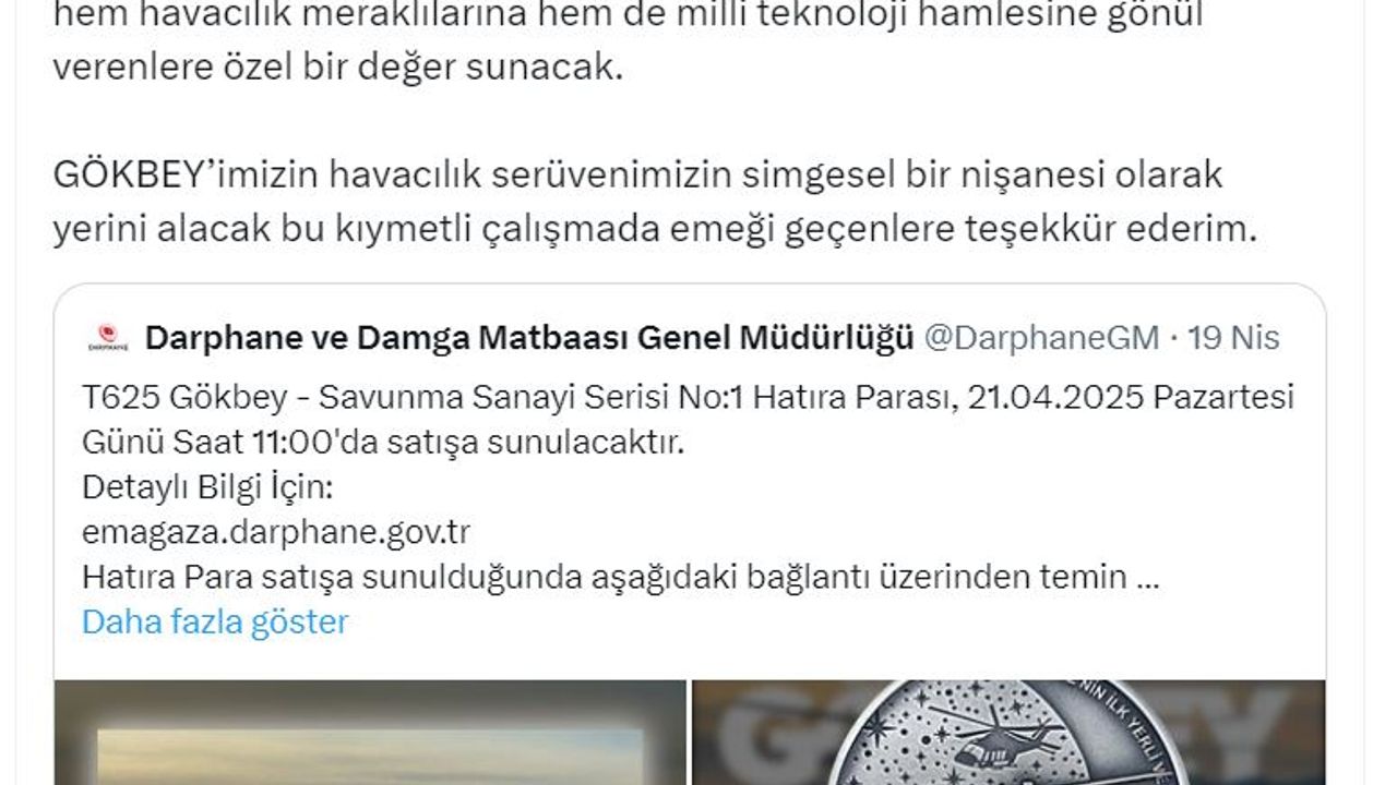 TUSAŞ Genel Müdürü Mehmet Demiroğlu, Darphane ve Damga Matbaası Genel Müdürlüğü'nün konuyla ilgili paylaşımını alıntılayarak, "Yerli ve milli ilk genel maksat helikopterimiz T625 GÖKBEY, Darphane'nin 'Savunma Sanayi Serisi' kapsamında hazırladığı ilk hatıra para ile koleksiyonseverlerle buluşuyor. Türk Savunma Sanayii'nin geldiği noktayı simgeleyen bu özel tasarım hem havacılık meraklılarına hem de milli teknoloji hamlesine gönül verenlere özel bir değer sunacak. GÖKBEY'imizin havacılık serüvenimizin simgesel bir nişanesi olarak yerini alacak bu kıymetli çalışmada emeği geçenlere teşekkür ederim" dedi. (DHA)