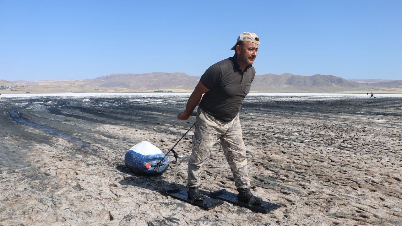 Gölde batmamak için kendi geliştirdiği 'helik' adını verdiği tahta ayakkabıları giydiğini söyleyen Ferdi Varol, “12 yaşından beri tuz çıkarıyorum. Mahalleden arkadaşlar ve komşularımız ile yıllardır tuz çıkarıyoruz. Ayağımıza helikleri giyip, çıkardığımız tuzu da kızağa koyup gölün kenarına taşıyoruz. Peynir, hamur ve turşu da kullanılıyor. Yörede yemeklere de kullanıyoruz. Sabah 04.30’da mahalleli olarak geliyoruz, 10.00’da da işimizi bitirip gidiyoruz. Geçen sene tuz olmadığı için bu yıl tuz daha kıymetli oldu. Biz de tuz çıkarmayı özlemiştik. Bu tuz peynirlerde çok kullanıldığı için peyniri cıvıtmama özelliği var. O yüzden şimdi peynir sezonu olduğu için köylerde müşterilerimiz beni bekliyor. 1 haftadır hasat yapıyorum. Günlük 10 torba tuz çıkarıyorum. Bazılarının da suyunu çekmesi için burada bırakıp ertesi gün alıyorum. Günlük 500 kilogram hasat yapıyorum” diye konuştu.