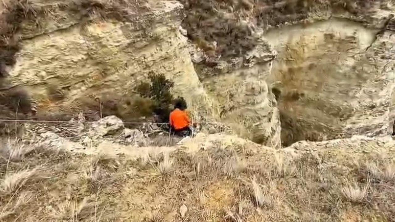Burdur'da avcılar uçuruma düşen av köpeklerini kendi imkanları ile metrelerce derinlikteki uçuruma halatla inerek sağ salim çıkardı.