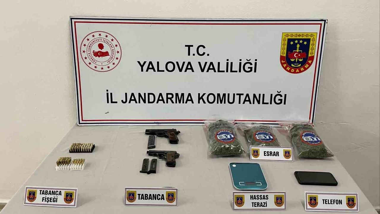 Alınan bilgiye göre, İl Jandarma Komutanlığı ekipleri, Çınarcık ilçesi Esenköy beldesinde E.Ö.'ye ait adrese yönelik operasyon gerçekleştirildi. Operasyonda 320 gram esrar, hassas terazi, 9 mm çapında tabanca, 7.65 mm çapında tabanca, 3 tabanca şarjörü, 64 adet 7.65 mm tabanca fişeği, 16 adet 9 mm tabanca fişeği, 1 adet cep telefonu ele geçirildi. Gözaltına alınan E.Ö, yasal işlemlerin ardından sevk edildiği adli makamlarca tutuklandı.